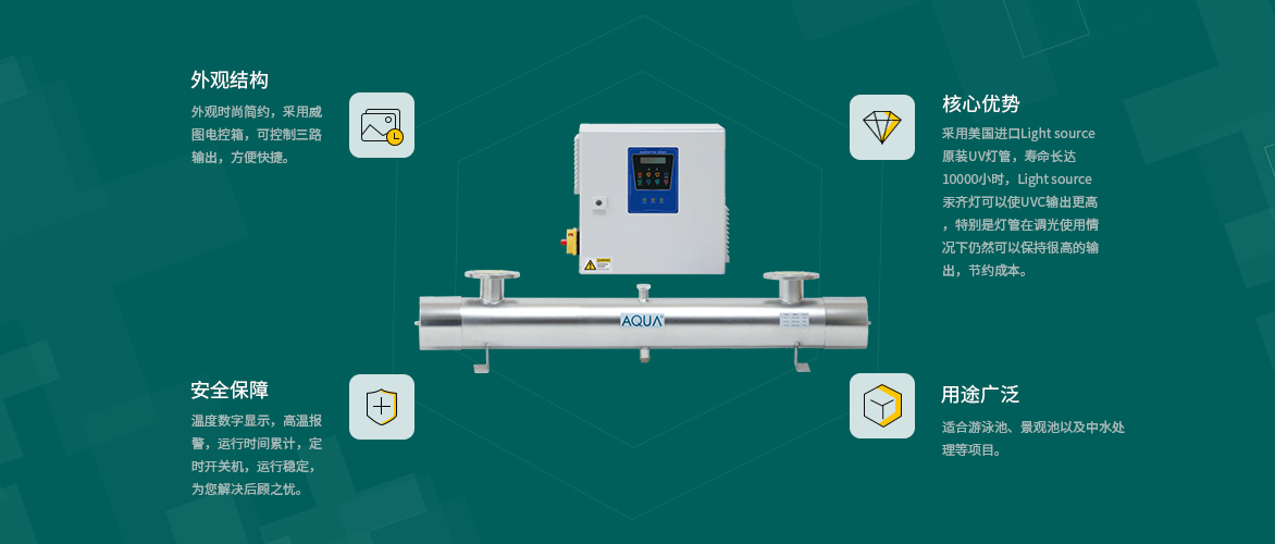 AQUA小黄片网址小黄片破解版设备旗下紫外线杀菌器UVS系列配有智能控制电箱,有温度显示、高温报警等多种功能。